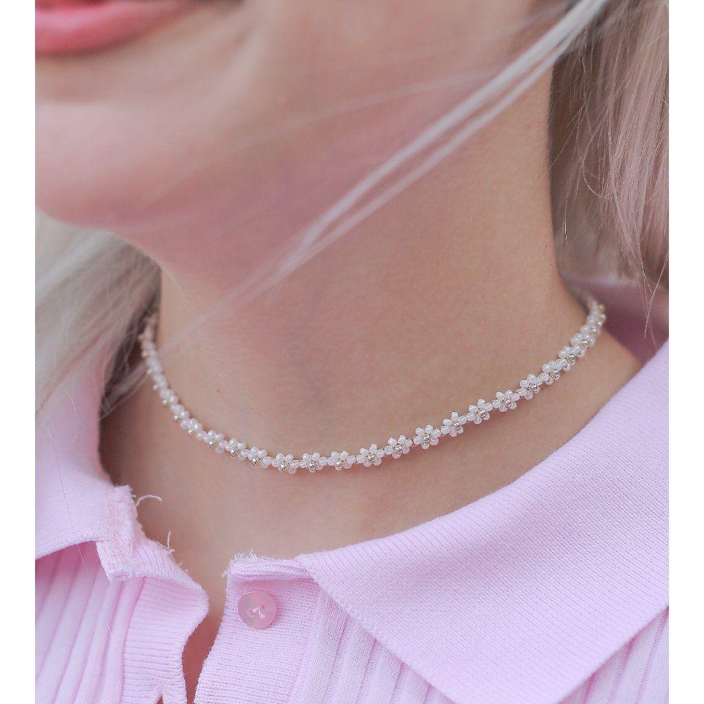 Chokery jsou lehké a pohodlné na nošení, nejsou navlečeny na pružné gumičce, ale na pevném vlasci - chokery se zapínají na karabinku o velikosti 1cm. V poslední kytičce je schovaný uzlík.